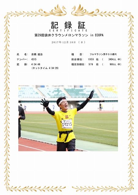 12月10日に出場した袋井クラウンメロンマラソンの記録証と