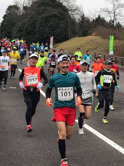 坂が大変多くタイムが出にくいコースなので、夢の100分切りや、3年前に名古屋シティで出した1時間40分56秒の自己ベストを狙うことはやめて、このコースでのベスト1時間43分45秒の更新を目標にしました。2.9度と、寒い日でしたが、仲間30人ほどで貸切バスで行ったので、着 替えも待機も快適でした。いざスタート、最初の下り坂でタイムを稼ぎ、下りは周りの人と同じスピードで、上りになるとかなり置いていかれる、いつものペースでした。 昨年9秒負けたごと~くんが100mほど前にずっと見えていましたが、追いつくことはできません。私はキロ当たり4分20~50秒位を保って走りました。ゴールまで3キロほどのところで後輩の竹内君が追いついてきて、このペースなら40分切りできますよ、と肩を叩いて抜かしていきました。40分切は想定外だったので、そうか、と思いましたが全く体が動かず、延々と続く最後の上り坂は失速しました。ラスト1キロで、何とかキロあたり4分台に戻してゴールしました。タイムは1時間40分21秒。一応目標としていたみのかものベストとハーフの自己ベスト更新です!バスで行った仲間30数人の中で5番目のタイムでした。 ただ、ごと~くんや竹内くんは40分を切ることができましたが、私は切れませんでした。 この日はせっかく調子が良く、もう少しで100分切りが達成できたのに、頑張りきれなかった原因を考えてみると、目標をそこにおいていなかったからだと思います。絶対に100分を切るぞ、と考えて挑んだら達成できた気がします。 この日の懇親会は嬉しい気持ちと少し悔しい気持ちと入り混じったお酒になりました。 次のレース、3月の静岡マラソンでは、絶対に3時間50分を切る、という目標で挑むつもりです。