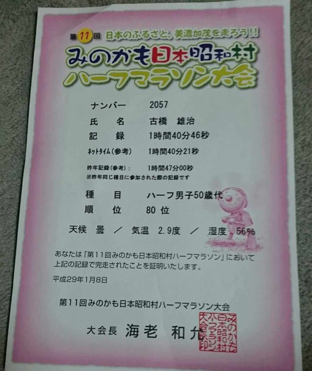 昨年末のレースの失敗を払拭するため、気持ちも新たに年明け早々、6回目のみのかもハーフマラソンに出場しました。