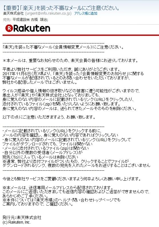 その後すぐに 楽天より 「楽天」を装った不審なメール
