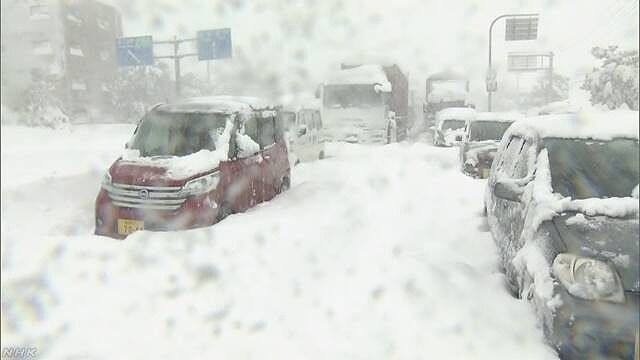 福井県の国道8号線で大雪のため車が立ち往生していて 大変な