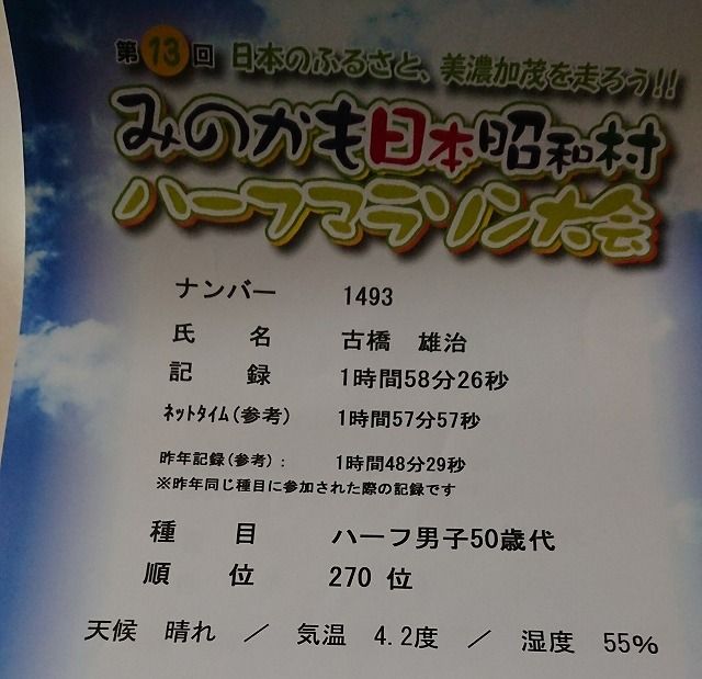 年明け早々 毎年恒例のみのかも昭和村ハーフマラソンに参加