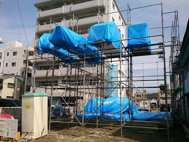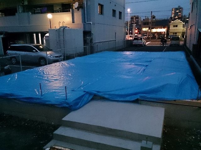 足場を組んで建て方の準備をする時も材料が濡れないように