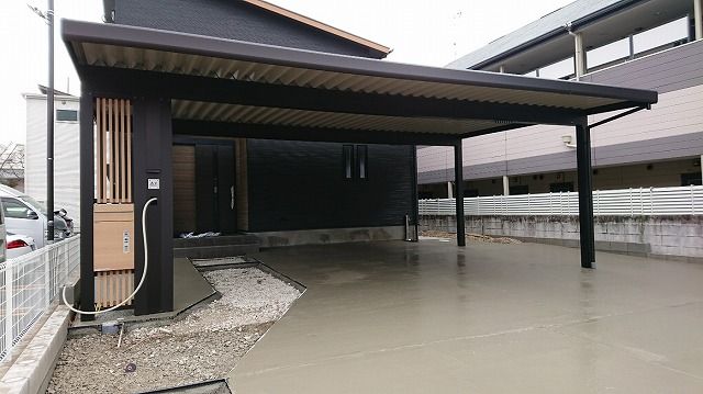 カーポートが取り付けられて土間コンクリートが敷かれると