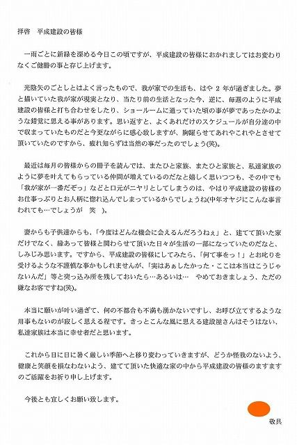 一雨ごとに新緑を深める今日この頃ですが 平成建設の皆様におかれましてはお変わりなくご健勝のことと存じ上げます。光陰矢のごとしとはよく言ったもので、我が家での生活もはや2年が過ぎました。夢と描いたいた我が家が現実となり、当たり前の生活となった今、逆に、毎週のように平成建設の皆様と打ち合わせをしたり、ショールームに通っていた頃の事が夢であったような錯覚に思える事があります。思い返すとよくあれだけのスケジュールが自分たちの中で収まっていたものだと今更ながらに感心致しますが、胸躍らせてあれやこれやとさせていただいていたのですから、疲れ知らずは当然の事だったのでしょう(笑)